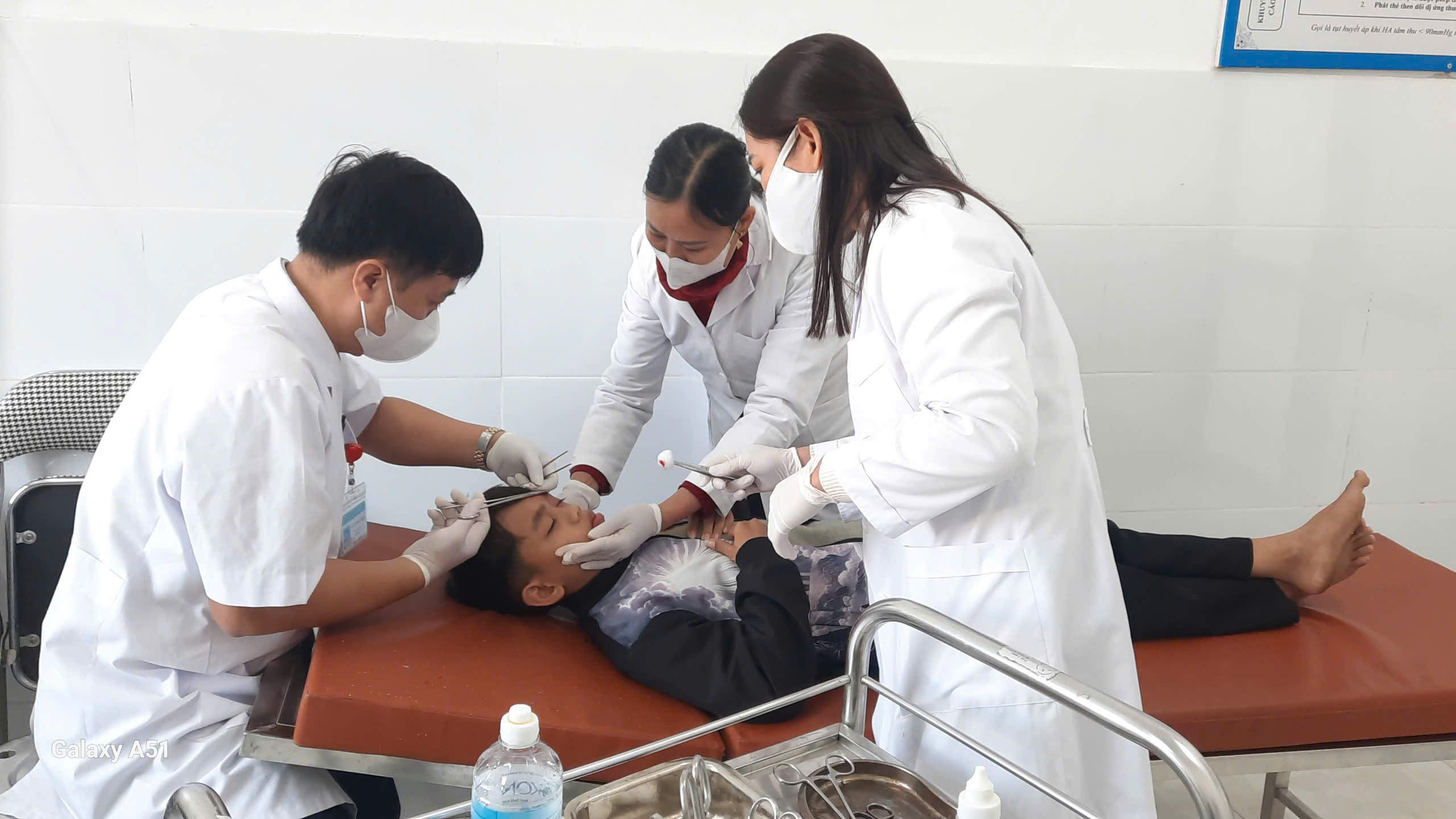 Cán bộ Trạm Y tế xã Yên Định khâu vết thương cho một em học sinh lớp 8 trường THCS bị chấn thương vùng chán.