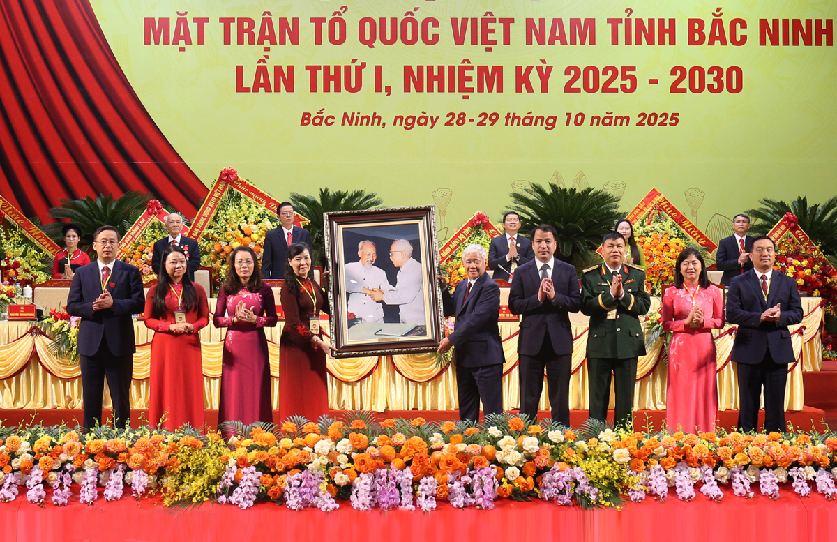 Các đồng chí lãnh đạo Ủy ban Trung ương MTTQ Việt Nam và tỉnh tặng hoa chúc mừng Ủy ban MTTQ tỉnh Bắc Ninh khóa I, nhiệm kỳ 2025 - 2030.