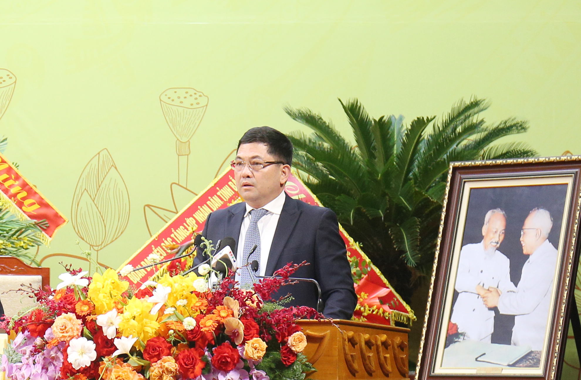 Bí thư Tỉnh ủy Nguyễn Hồng Thái, Phó Bí thư Thường trực Tỉnh ủy Nguyễn Thị Hương, Chủ tịch UBND tỉnh Vương Quốc Tuấn, Chủ tịch HĐND tỉnh Nguyễn Việt Oanh và Phó Chủ tịch UBND tỉnh, Trưởng Đoàn ĐBQH tỉnh Phạm Văn Thịnh (bên phải) trao tặng Đại hội bức Trướng "Đoàn kết - Dân chủ - Đổi mới - Phát triển".
