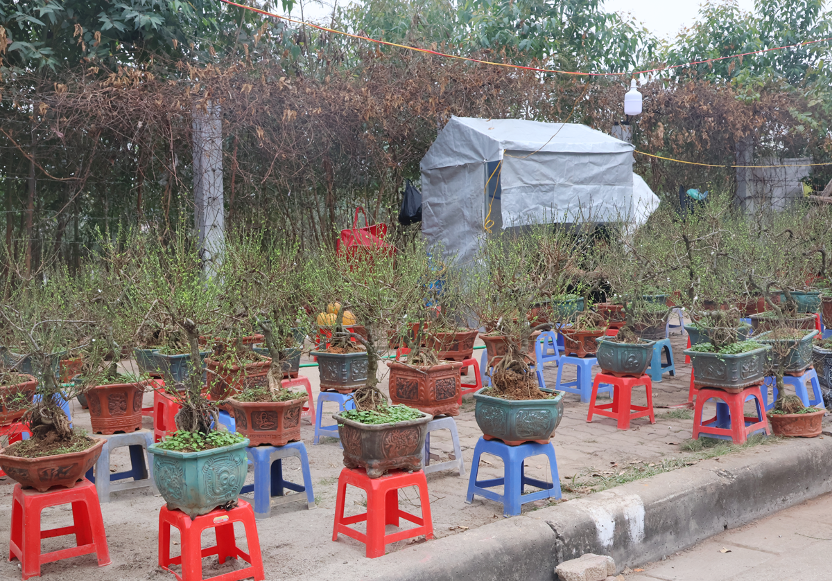 Bên cạnh những dãy đào khoe sắc thắm, là những dãy quất vàng chín mọng, thu hút người đi đường.