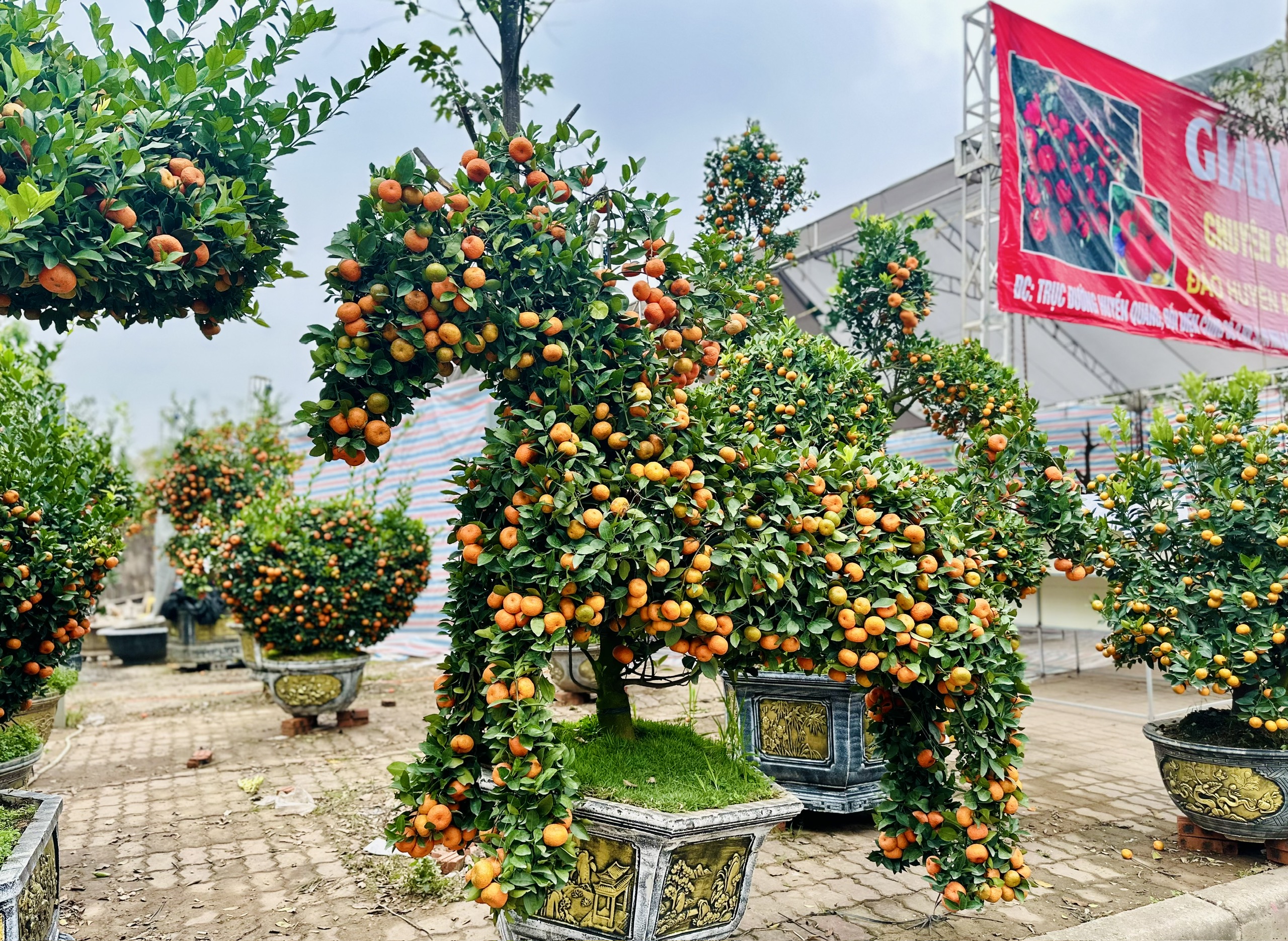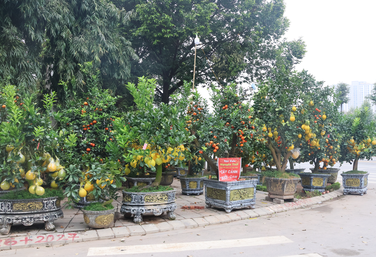 Nhiều chậu bưởi, cam canh sai trĩu quả được bày bán, mang đậm hương sắc mùa Xuân và biểu tượng của tài lộc, thịnh vượng trong năm mới.