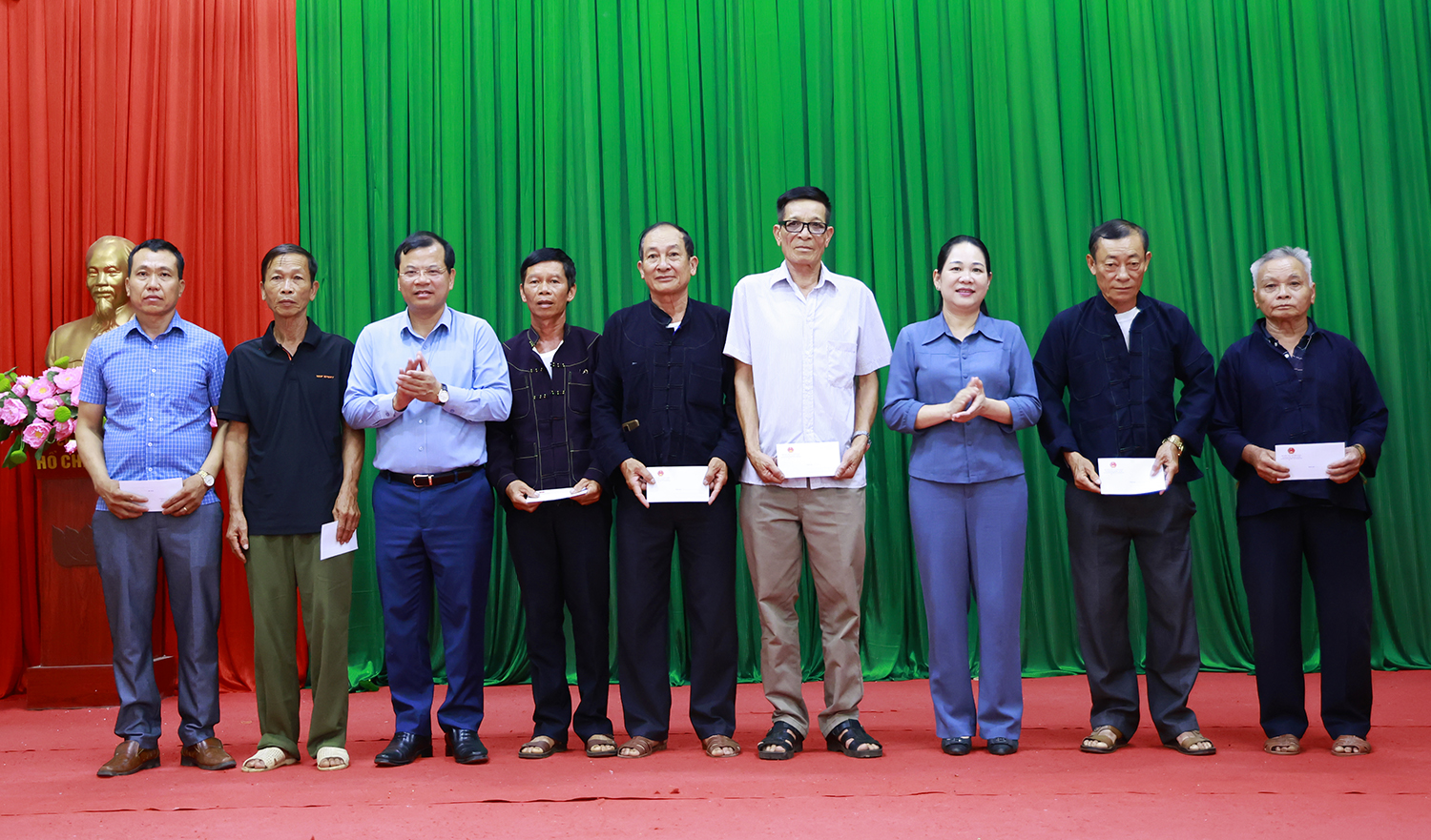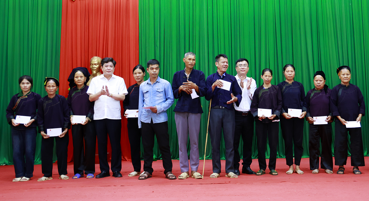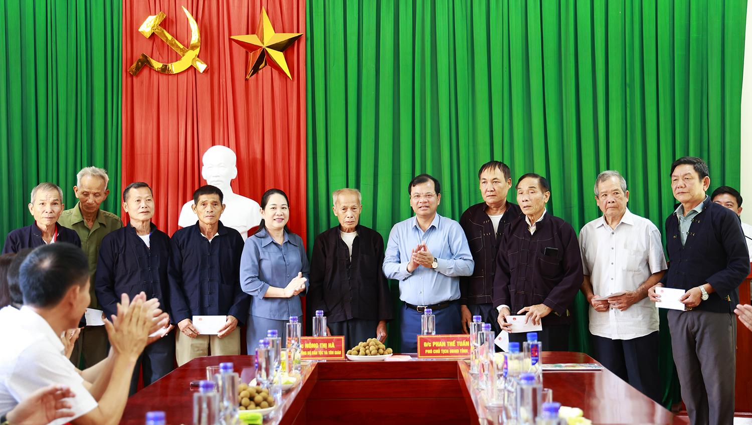 Thứ trưởng Bộ Dân tộc và Tôn giáo Nông Thị Hà, Phó Chủ tịch UBND tỉnh Bắc Ninh Phan Thế Tuấn tặng quà cho người có uy tín trong đồng bào DTTS xã Sơn Hải.
