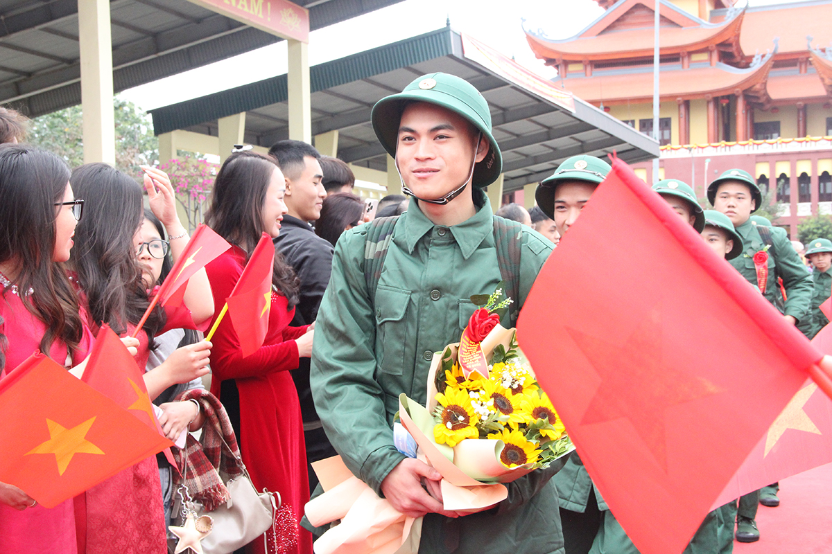 Giữa sắc cờ rực đỏ, tân binh vững bước lên đường thực hiện nghĩa vụ quân sự.
