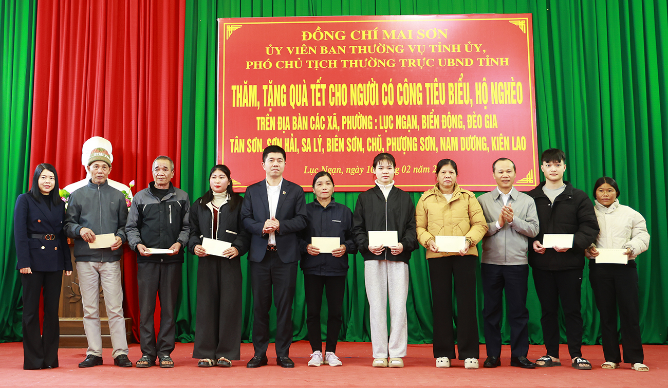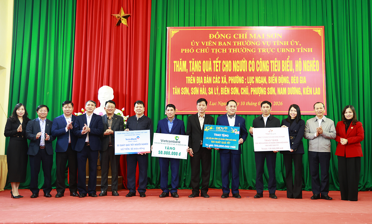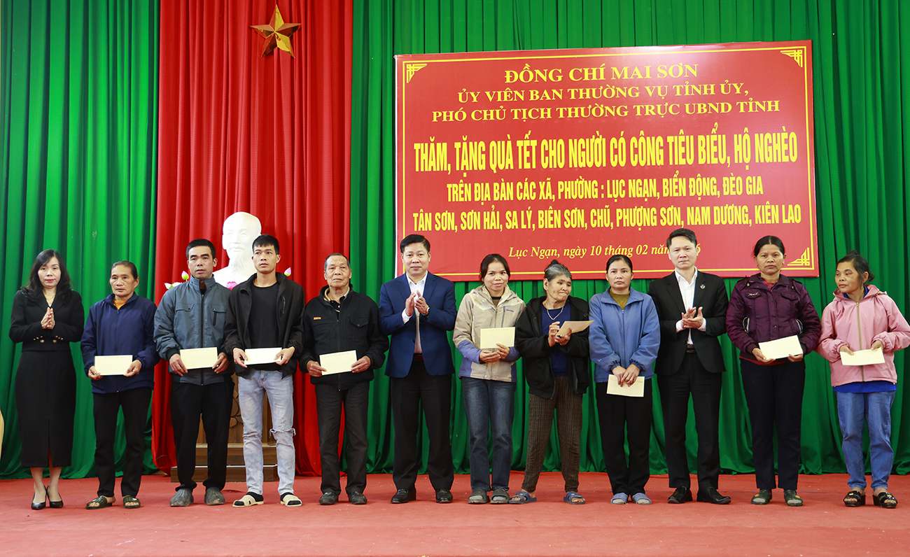 (BNP) - Nhân dịp Tết Nguyên đán Bính Ngọ 2026, chiều 09/02, đồng chí Mai Sơn, Ủy viên Ban Thường vụ Tỉnh ủy, Phó Chủ tịch Thường trực UBND tỉnh đã đến thăm, tặng quà Tết người có công tiêu biểu, hộ nghèo tại các xã, phường: Biển Động, Đèo Gia, Lục Ngạn, Kiên Lao, Tân Sơn, Sa Lý, Sơn Hải, Biên Sơn, Nam Dương, Chũ và Phượng Sơn.