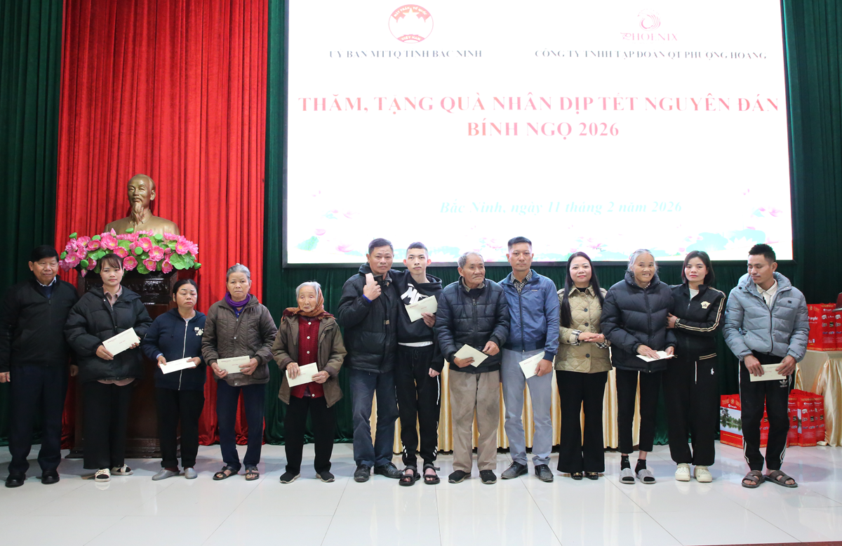 (BNP) - Nhân dịp Tết Nguyên đán Bính Ngọ 2026, sáng 11/02, Đoàn công tác do Phó Chủ tịch Thường trực Ủy ban MTTQ tỉnh Ngụy Thị Tuyến làm trưởng đoàn cùng với Công ty TNHH Tập đoàn Quốc tế Phượng Hoàng đến thăm, tặng quà 30 hộ gia đình có hoàn cảnh khó khăn trên địa bàn 2 xã Gia Bình và Lương Tài.