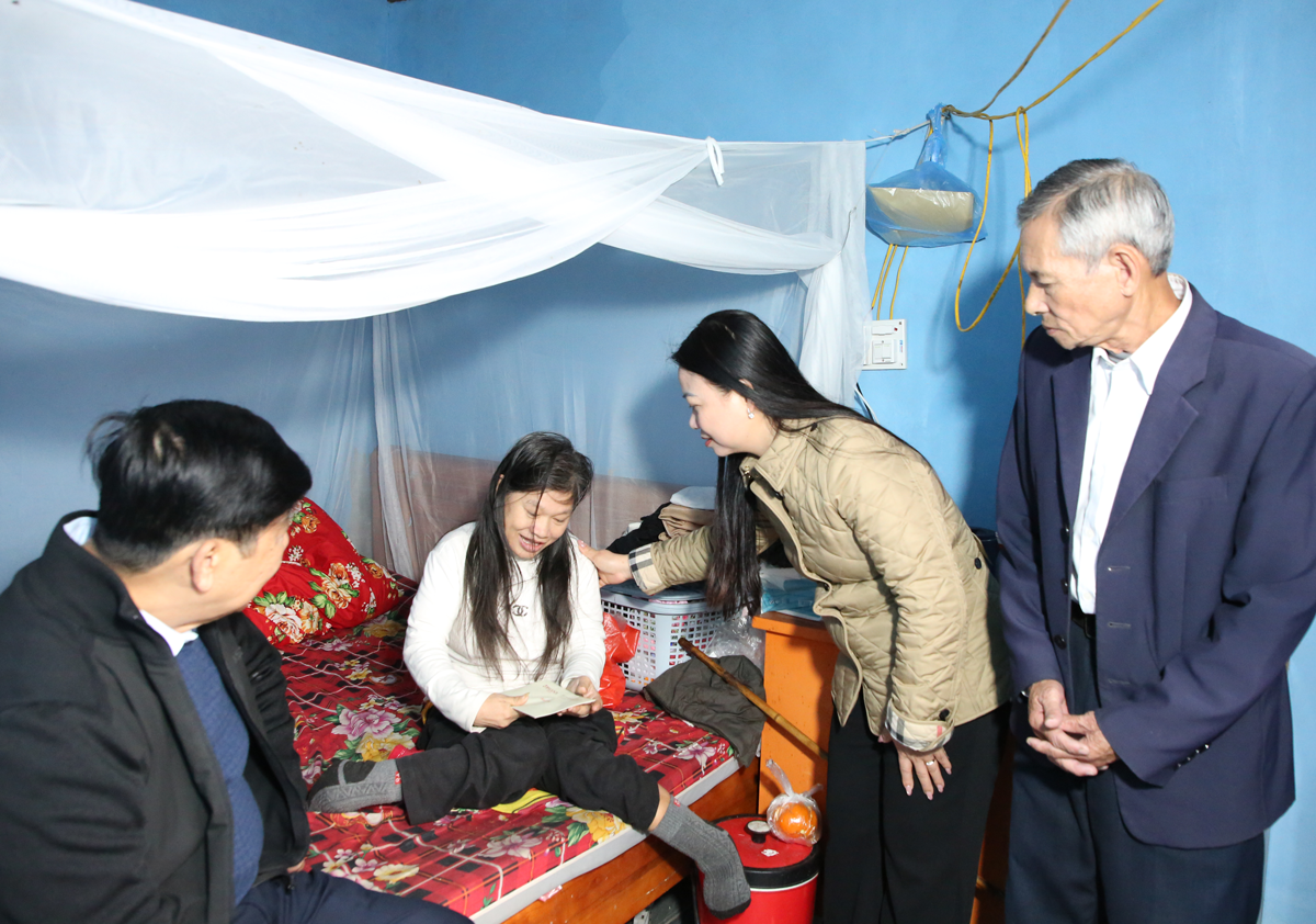 Phó Chủ tịch Thường trực Ủy ban MTTQ tỉnh Ngụy Thị Tuyến và Chủ tịch Công ty TNHH Tập đoàn Quốc tế Phượng Hoàng Nguyễn Văn Hùng thăm hỏi sức khỏe và tặng quà bà Nguyễn Thị Thoảng, thôn Hương Vinh, xã Gia Bình bị bại não từ nhỏ.