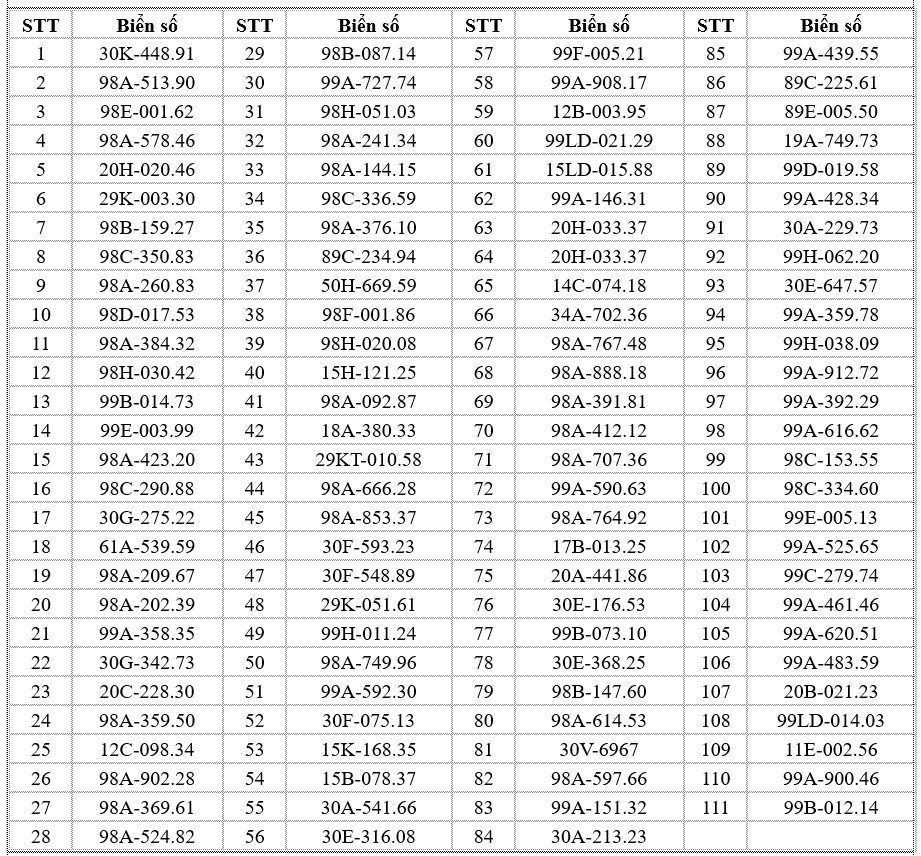 Các chủ phương tiện có tên trong danh sách chủ động liên hệ Phòng CSGT Công an tỉnh Bắc Ninh hoặc các đội CSGT phụ trách địa bàn để giải quyết vi phạm theo đúng quy định. Các trường hợp cố tình chậm trễ sẽ bị xử lý nghiêm theo luật định./.