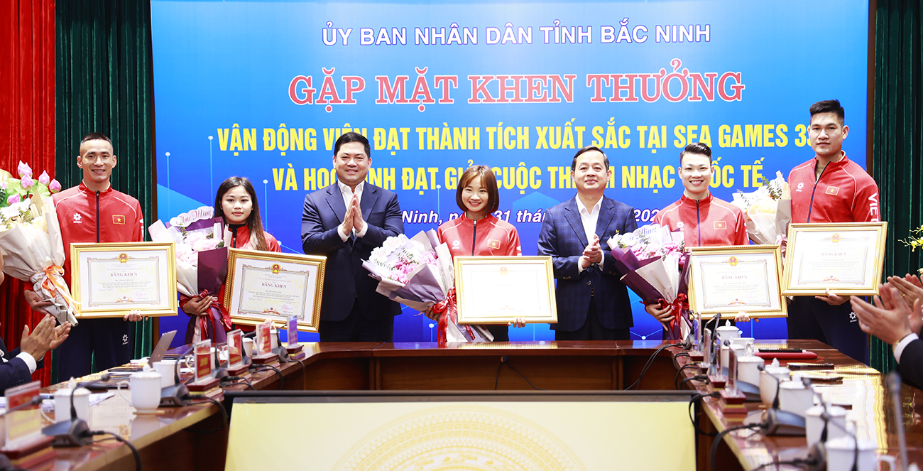 (BNP) - Sáng 31/12, UBND tỉnh Bắc Ninh tổ chức gặp mặt, khen thưởng các vận động viên đạt thành tích xuất sắc tại Đại hội Thể thao Đông Nam Á lần thứ 33 (SEA Games 33) và học sinh đạt giải Cuộc thi Âm nhạc quốc tế.