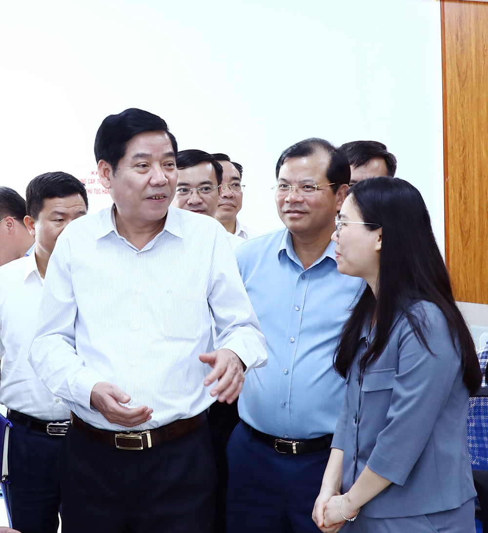 Đồng chí Bí thư Tỉnh ủy trao đổi với lãnh đạo phường Yên Dũng tại Trung tâm Phục vụ hành chính công của phường.