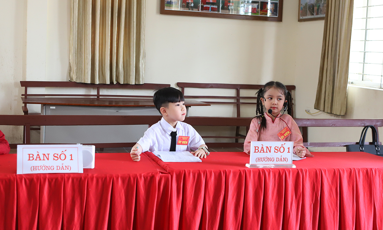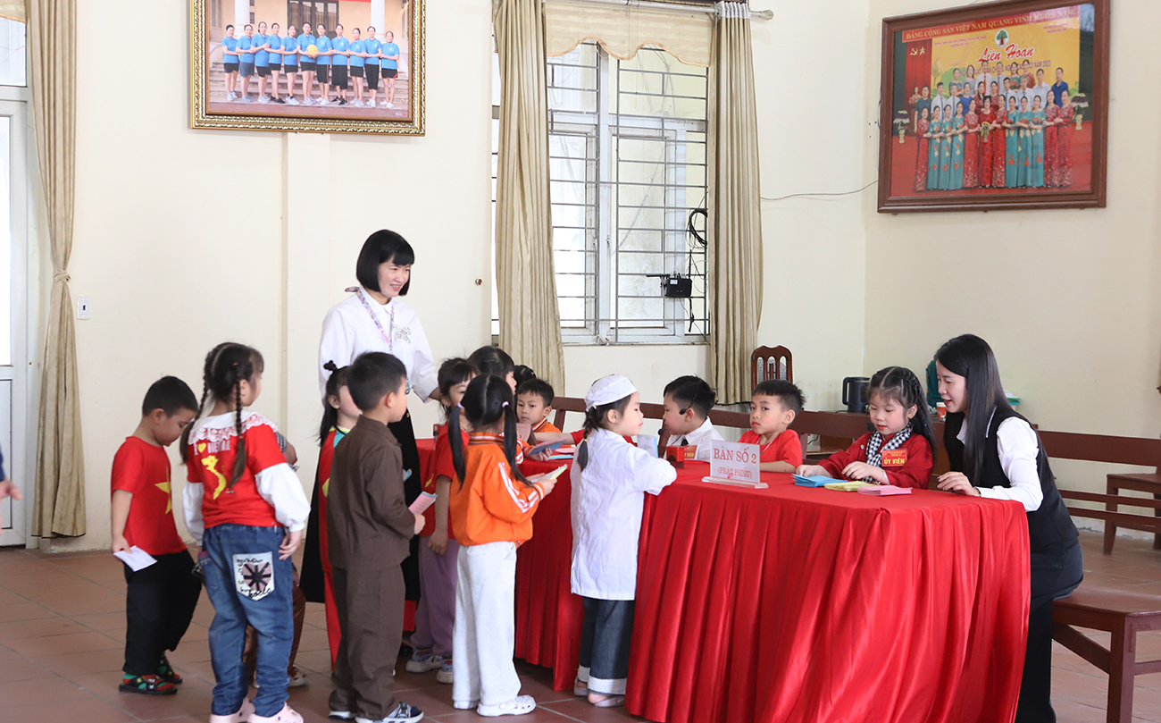 Giáo viên và học sinh trường mầm non trên địa bàn phường Việt Yên tham gia tuyên truyền, trải nghiệm các nội dung bầu cử.