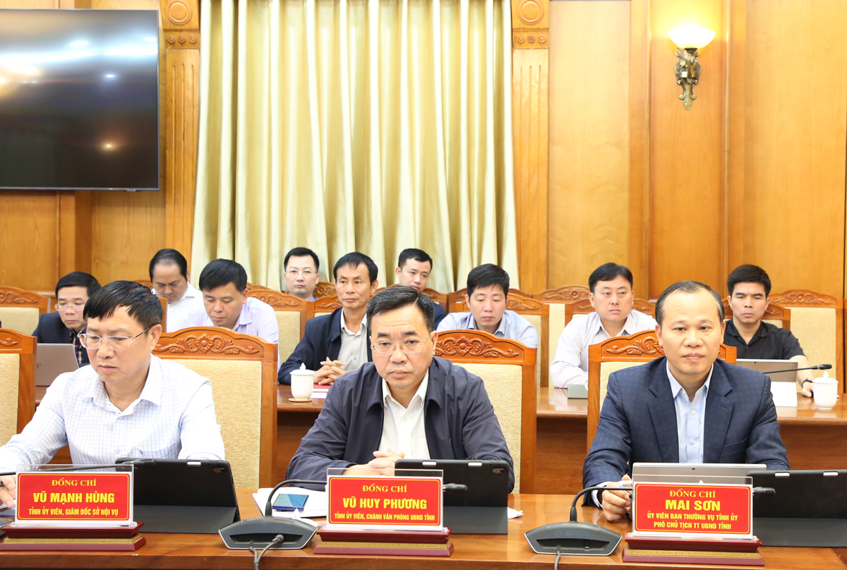 Từ phải qua: Đồng chí Mai Sơn, Phó Chủ tịch Thường trực UBND tỉnh; Chánh Văn phòng UBND tỉnh Vũ Huy Phương; Giám đốc Sở Nội vụ Vũ Mạnh Hùng dự hội nghị.
