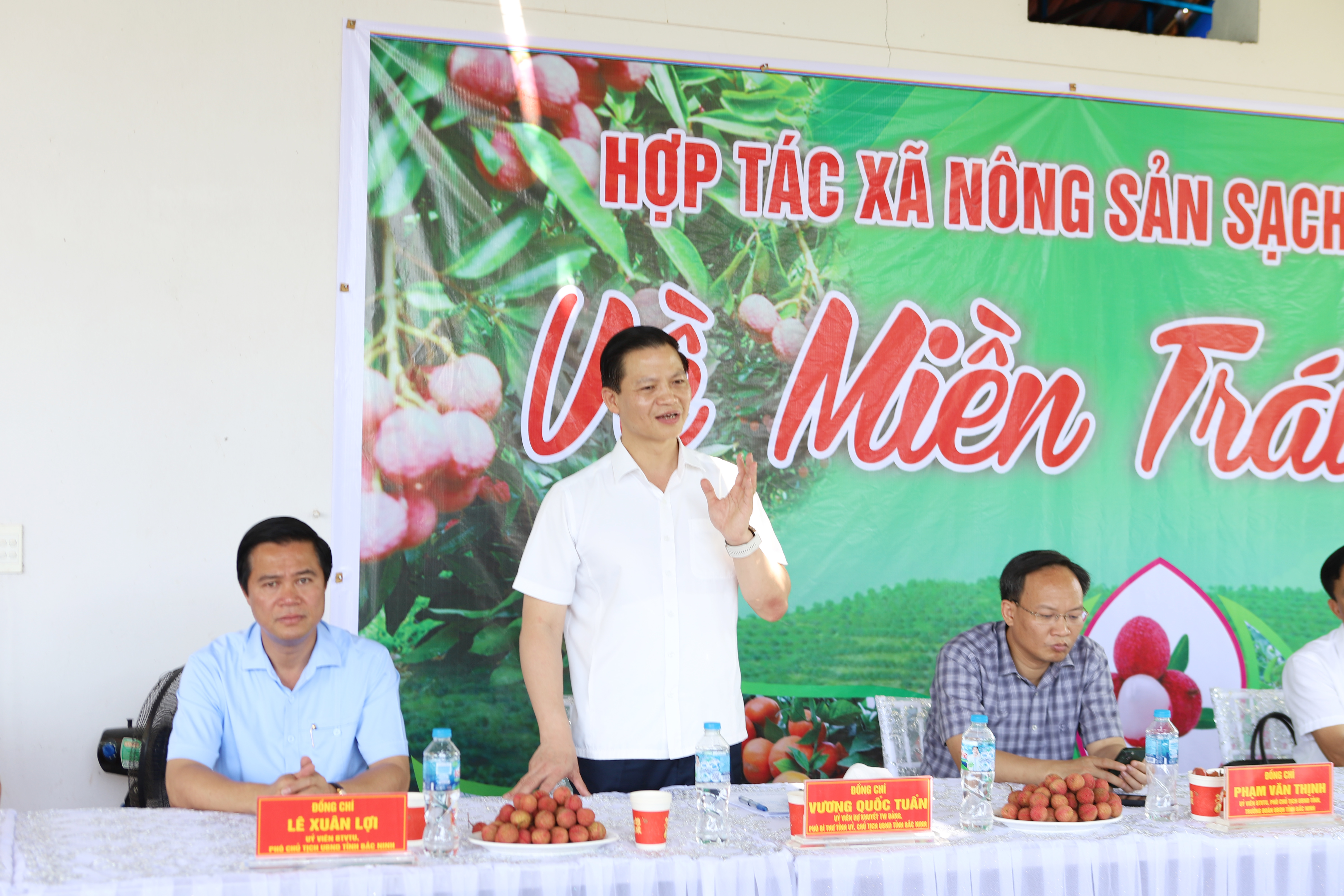 (BNP) - Sáng 05/7, đồng chí Vương Quốc Tuấn, Ủy viên Dự khuyết Ban Chấp hành Trung ương Đảng, Phó Bí thư Tỉnh ủy, Chủ tịch UBND tỉnh Bắc Ninh đi thăm quan thực tế tình hình sản xuất, tiêu thụ vải thiều cho các doanh nghiệp trong các khu công nghiệp (KCN) và khảo sát, nghe ý tưởng quy hoạch xây dựng khu chế biến nông sản công nghệ cao tại phường Phượng Sơn, Chũ và xã Lục Ngạn.