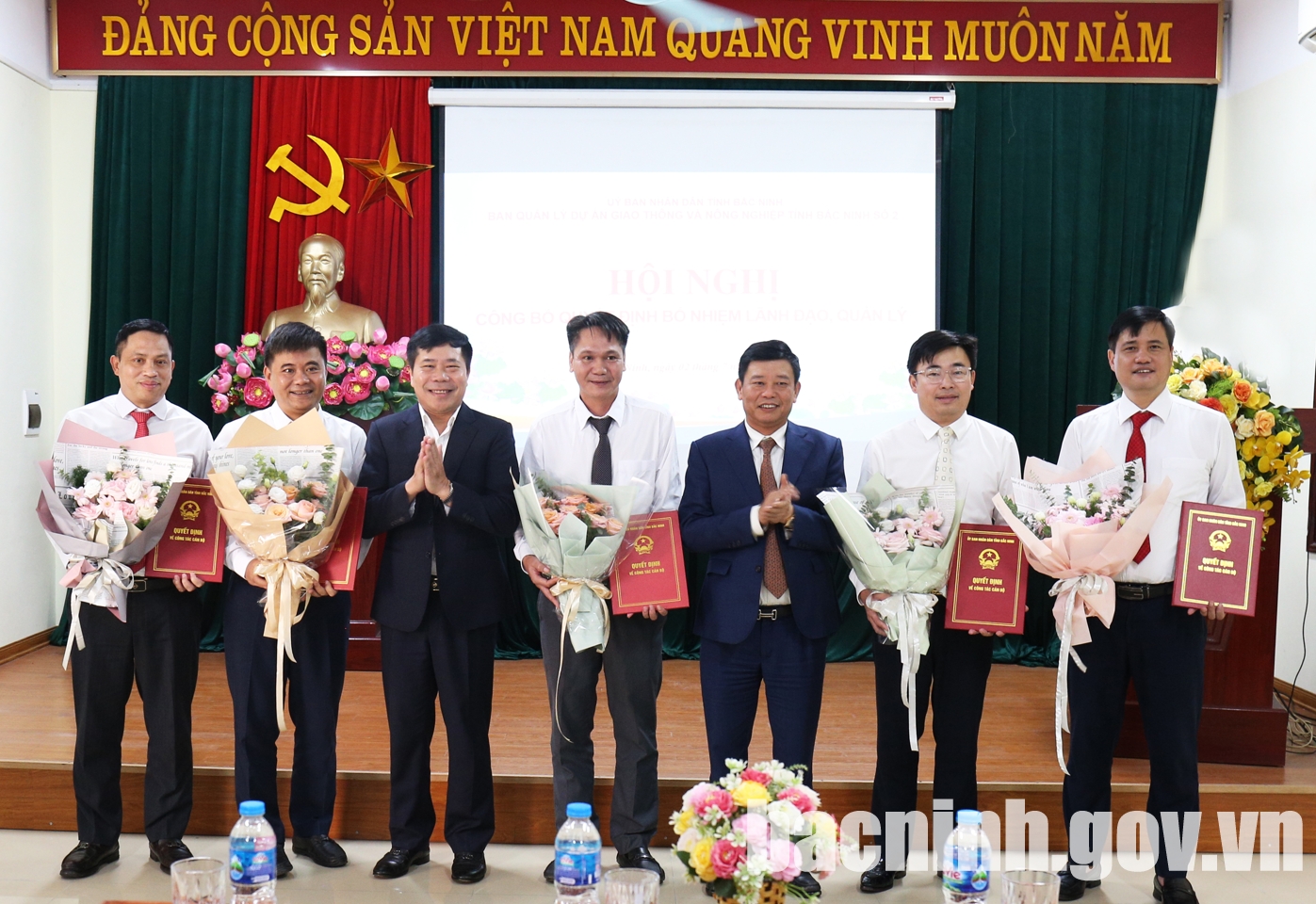 Phó Chủ tịch UBND tỉnh Ngô Tân Phượng (thứ 3 từ phải qua) và Giám đốc Ban Quản lý dự án Giao thông và Nông nghiệp tỉnh Bắc Ninh số 2 Nguyễn Xuân Đương (thứ 3 từ trái qua) trao Quyết định và tặng hoa cho các Phó Giám đốc.
