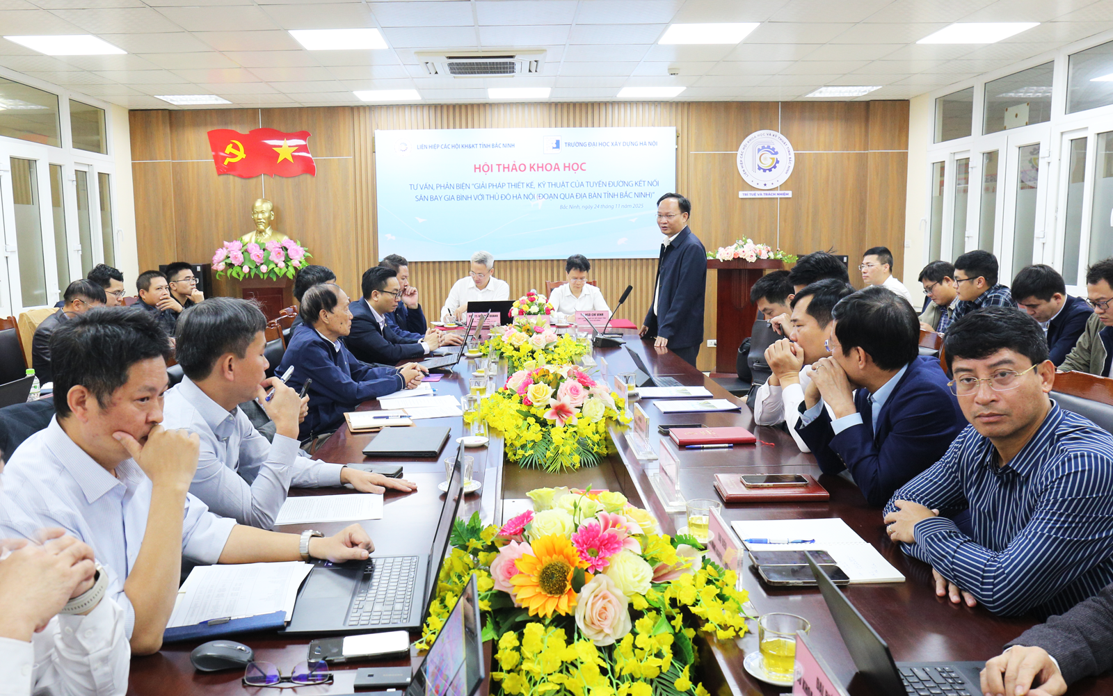 Sáng 24/11, Liên hiệp các Hội Khoa học và Kỹ thuật (KH&KT) tỉnh Bắc Ninh phối hợp với Trường Đại học Xây dựng Hà Nội tổ chức hội thảo khoa học tư vấn, phản biện “Giải pháp thiết kế, kỹ thuật của tuyến đường kết nối Sân bay Gia Bình với thủ đô Hà Nội (đoạn qua địa bàn tỉnh Bắc Ninh)”. Đồng chí Ngô Chí Vinh, Chủ tịch Liên hiệp các hội KH&KT tỉnh và PGS.TS Bùi Phú Doanh, Phó Hiệu trưởng Trường Đại học Xây dựng Hà Nội đồng chủ trì hội thảo. Dự hội thảo có đồng chí Phạm Văn Thịnh, Ủy viên Ban Thường vụ Tỉnh ủy, Phó Chủ tịch UBND tỉnh, Trưởng Đoàn ĐBQH tỉnh; lãnh đạo một số sở, ban, ngành tỉnh; đơn vị tư vấn thiết kế, các chuyên gia, nhà khoa học đến từ Trường Đại học Xây dựng Hà Nội, Đại học Giao thông Vận tải Hà nội, Viện Kỹ thuật Công trình đặc biệt, Học viện Kỹ thuật Quân sự.