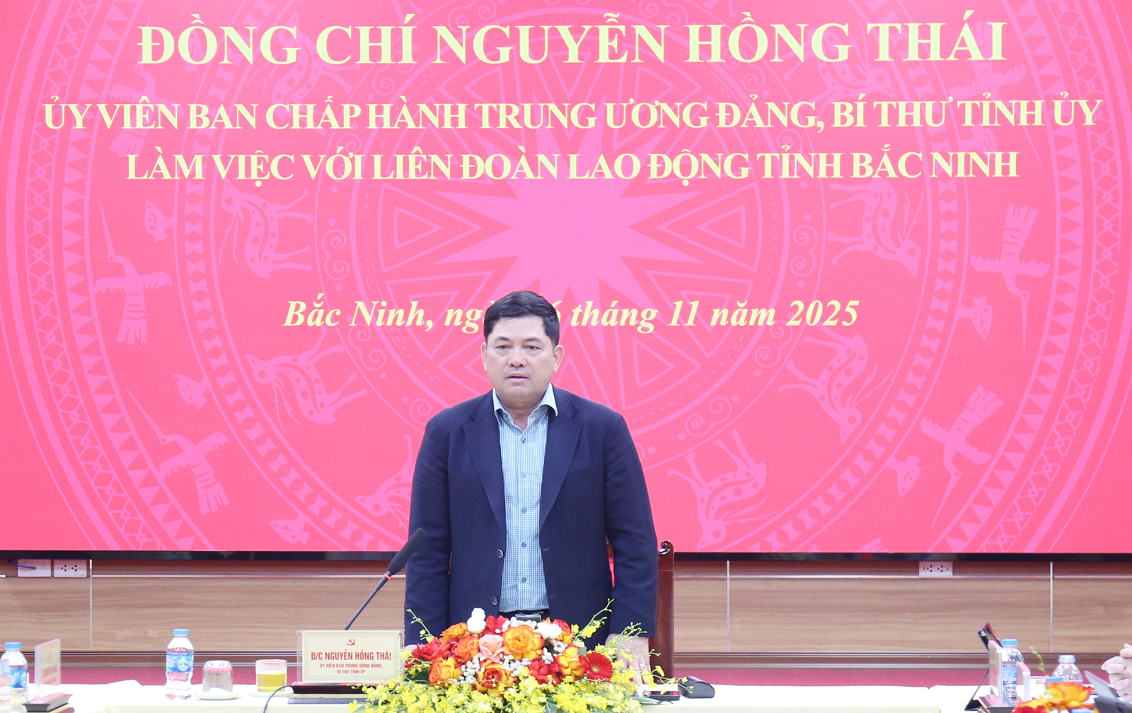 Sáng 26/11, đồng chí Nguyễn Hồng Thái, Ủy viên Ban Chấp hành Trung ương Đảng, Bí thư Tỉnh ủy làm việc với Liên đoàn Lao động (LĐLĐ) tỉnh để nắm tình hình tổ chức và hoạt động của LĐLĐ tỉnh. Cùng dự có đồng chí Nguyễn Thị Hương, Phó Bí thư Thường trực Tỉnh ủy; các đồng chí Ủy viên Ban Thường vụ Tỉnh ủy: Lê Xuân Lợi, Phó Chủ tịch UBND tỉnh; Vũ Minh Hiếu, Trưởng Ban Tổ chức Tỉnh ủy; Nguyễn Thị Hà, Chủ tịch Ủy ban MTTQ tỉnh; Bùi Duy Hưng, Giám đốc Công an tỉnh; lãnh đạo một số sở, ngành liên quan.