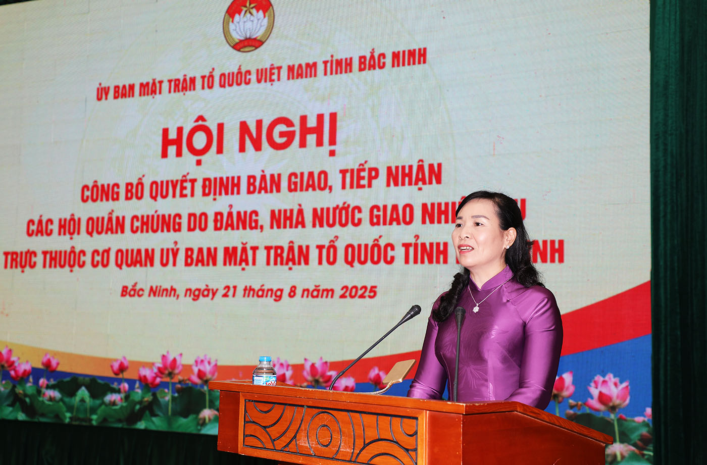 (BNP) - Chiều 20/8, Ủy ban MTTQ tỉnh Bắc Ninh tổ chức hội nghị công bố quyết định bàn giao, tiếp nhận các hội quần chúng do Đảng, Nhà nước giao nhiệm vụ về trực thuộc cơ quan Ủy ban MTTQ tỉnh. Đồng chí Nguyễn Thị Hà, Ủy viên Ban Thường vụ Tỉnh ủy, Chủ tịch Ủy ban MTTQ tỉnh chủ trì hội nghị.