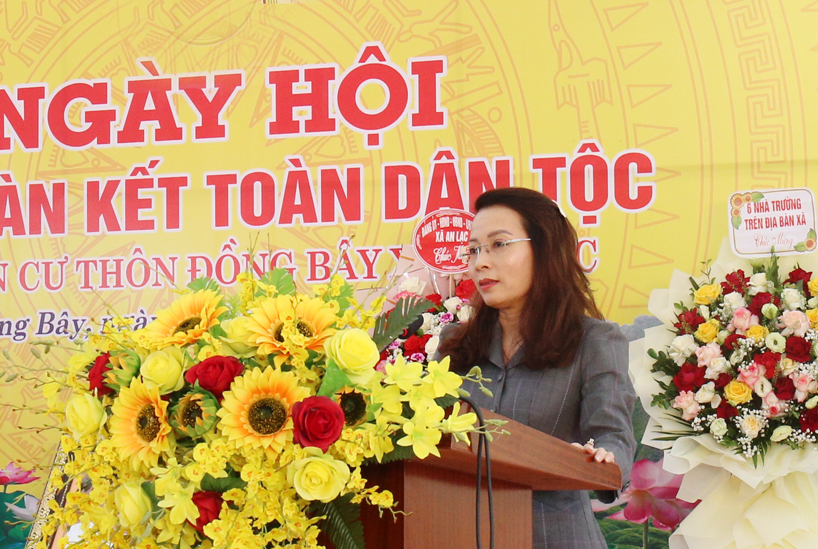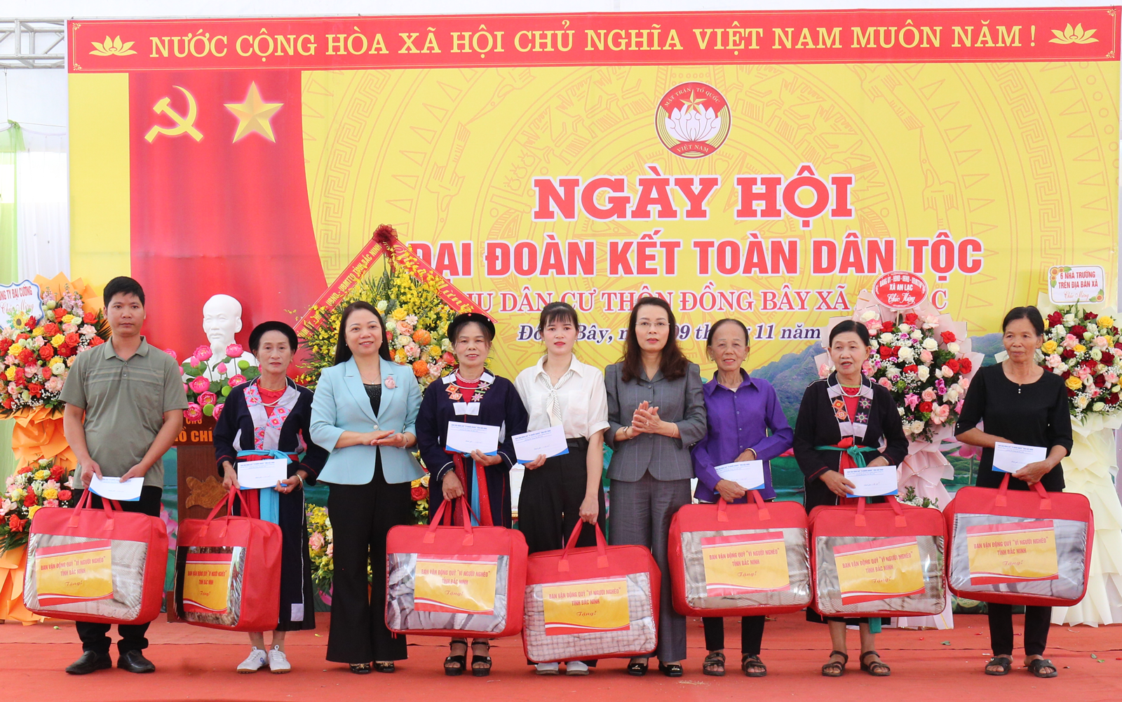 Tại Chương trình, thay mặt Tỉnh ủy, HĐND, UBND, Ủy ban MTTQ tỉnh, Phó Bí thư Thường trực Tỉnh ủy Nguyễn Thị Hương tặng hoa và bức ảnh "Bác Hồ và Bác Tôn" chúc mừng Ngày hội. Đồng thời, trao tặng bộ máy vi tính và máy phát điện với tổng trị giá 20 triệu đồng; trao tặng quà cho 08 hộ nghèo, hộ có hoàn cảnh khó khăn trên địa bàn thôn Đồng Bây (mỗi hộ gia đình 1 triệu đồng và 1 chiếc chăn bông).