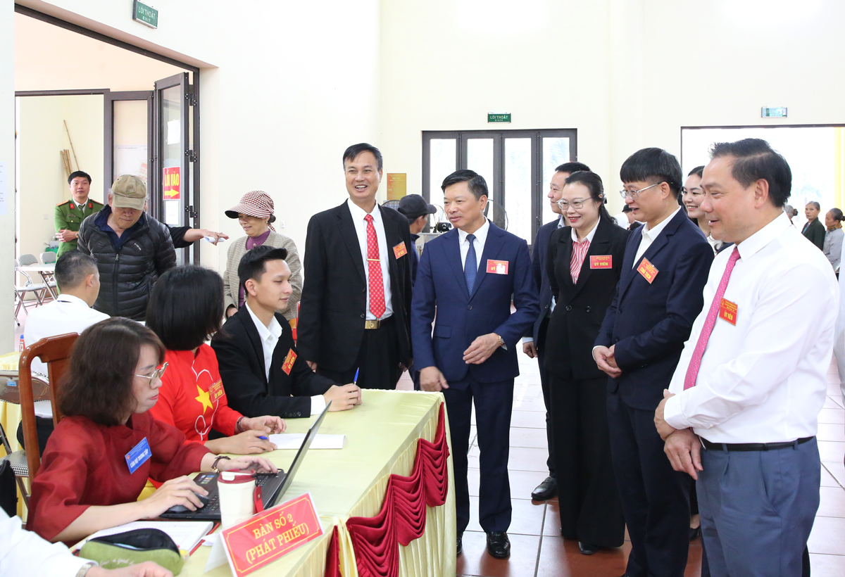 Phó Chủ tịch UBND tỉnh Đào Quang Khải kiểm tra, động viên các thành viên Tổ bầu cử thực hiện nhiệm vụ tại Nhà văn hóa thôn Chè, xã Liên Bão.