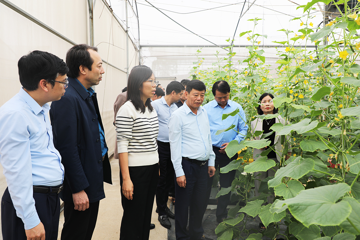 Phó Chủ tịch UBND tỉnh Ngô Tân Phượng (thứ 4 bên trái) thăm mô hình sản xuất dưa baby trong nhà lưới của HTX Rau sạch Yên Dũng (phường Cảnh Thụy).