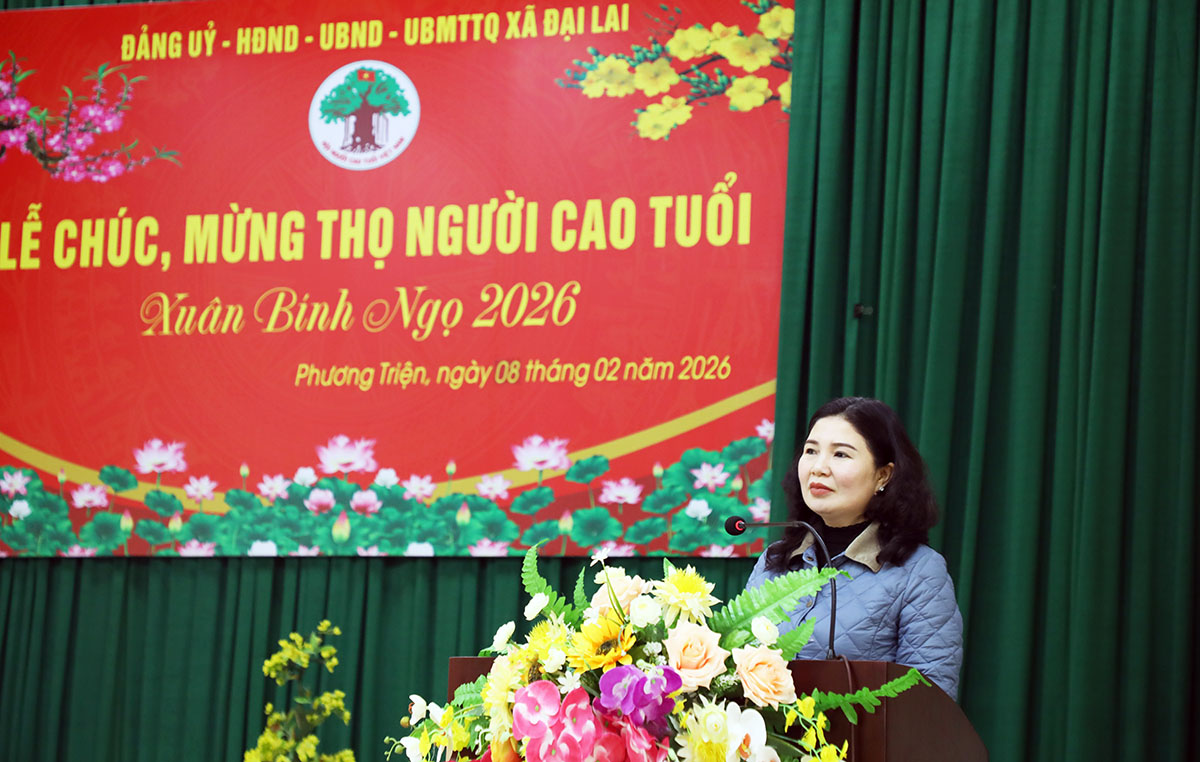 Phó Trưởng Đoàn ĐBQH tỉnh Trần Thị Vân gửi lời chúc mừng tới các cụ của thôn Phương Triện, xã Đại Lai được mừng thọ trong dịp Xuân Bính Ngọ 2026, chúc các cụ luôn giữ gìn sức khỏe, trường thọ, là vốn quý, tấm gương sáng cho con cháu và Nhân dân địa phương noi theo. Đồng chí thông tin nhanh về kết quả thực hiện nhiệm vụ phát triển kinh tế - xã hội của tỉnh đạt được năm 2025, với nhiều chỉ tiêu xếp tốp đầu cả nước; an sinh xã hội, nhất là chăm lo cho lớp người cao tuổi, người có công, hộ nghèo, cận nghèo được chú trọng, đời sống vật chất, tinh thần của Nhân dân không ngừng được cải thiện, nâng cao. Có được kết quả đó, có sự đóng góp của cán bộ, Nhân dân thôn Phương Triện, xã Đại Lai.