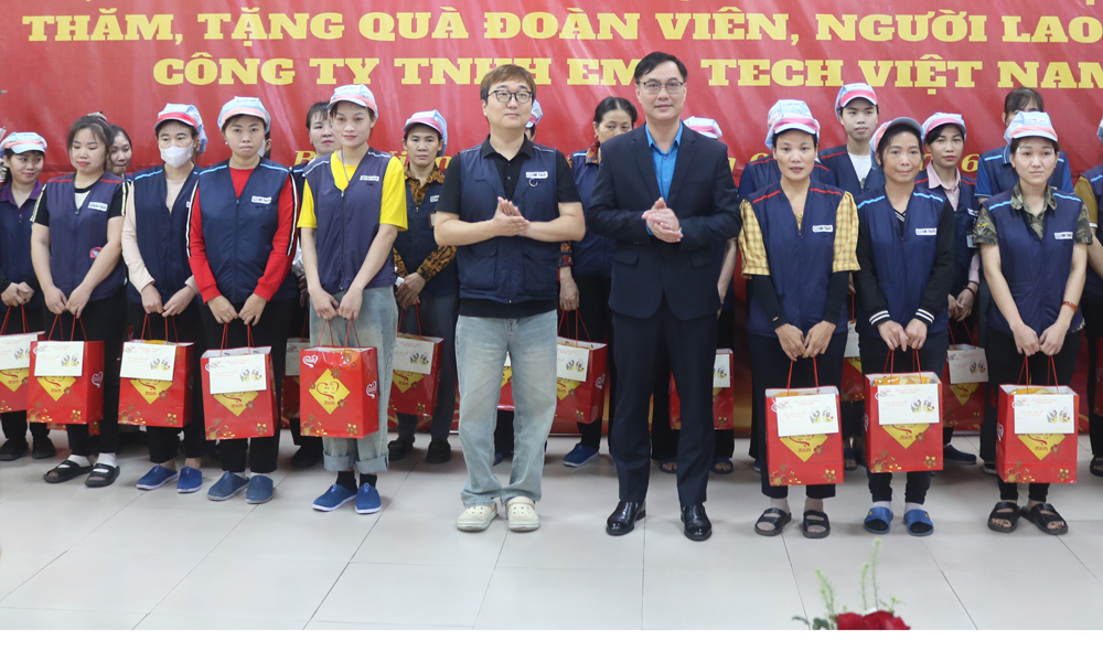 Tại Công ty TNHH Em-Tech Việt Nam, đồng chí Phó Trưởng Đoàn đại biểu Quốc hội tỉnh Trần Thị Vân trực tiếp tham quan xưởng sản xuất, thăm hỏi điều kiện làm việc và đời sống của công nhân lao động trong Công ty. Đồng chí chúc Tết, trao quà tặng của Tỉnh ủy, HĐND, UBND, Ủy ban MTTQ tỉnh cho tập thể công ty cùng 100 suất quà cho các đoàn viên, công nhân lao động có hoàn cảnh khó khăn.