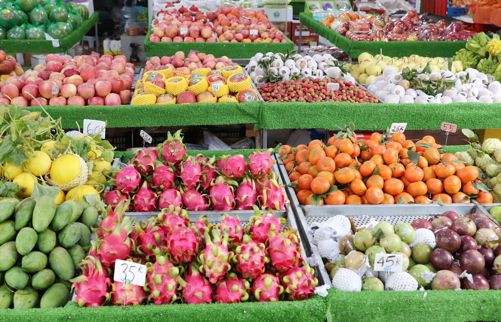 Những loại quả bày mâm ngũ quả như: Thanh long, cam, táo, bưởi, chuối, trầu cau...