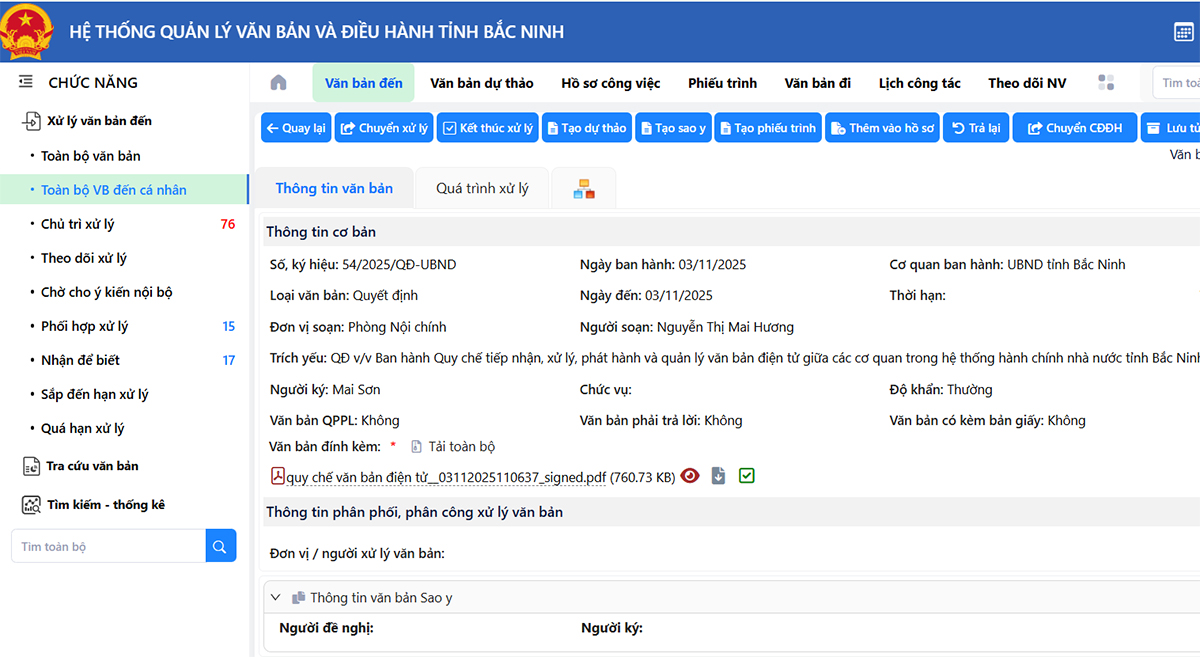 (BNP) - Đồng chí Mai Sơn, Phó Chủ tịch Thường trực UBND tỉnh vừa ký ban hành Quyết định số 54/2025/QĐ-UBND về việc ban hành Quy chế tiếp nhận, xử lý, phát hành và quản lý văn bản điện tử giữa các cơ quan trong hệ thống hành chính nhà nước tỉnh Bắc Ninh.
