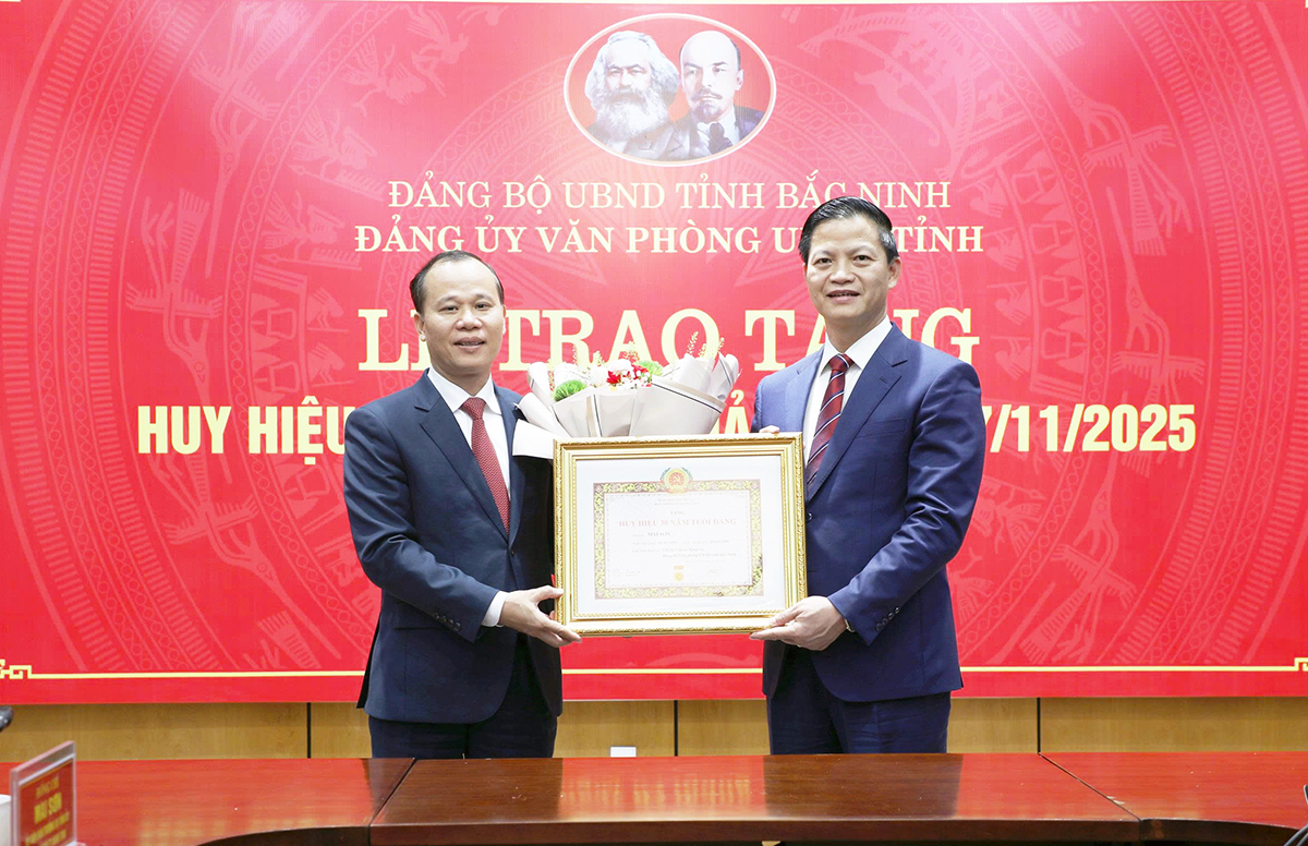 Phó Bí thư Tỉnh ủy, Chủ tịch UBND tỉnh Vương Quốc Tuấn (bên phải) trao Huy hiệu 30 năm tuổi Đảng đợt 07/11/2025 cho đồng chí Mai Sơn, Ủy viên Ban Thường vụ Tỉnh ủy, Phó Chủ tịch Thường trực UBND tỉnh.