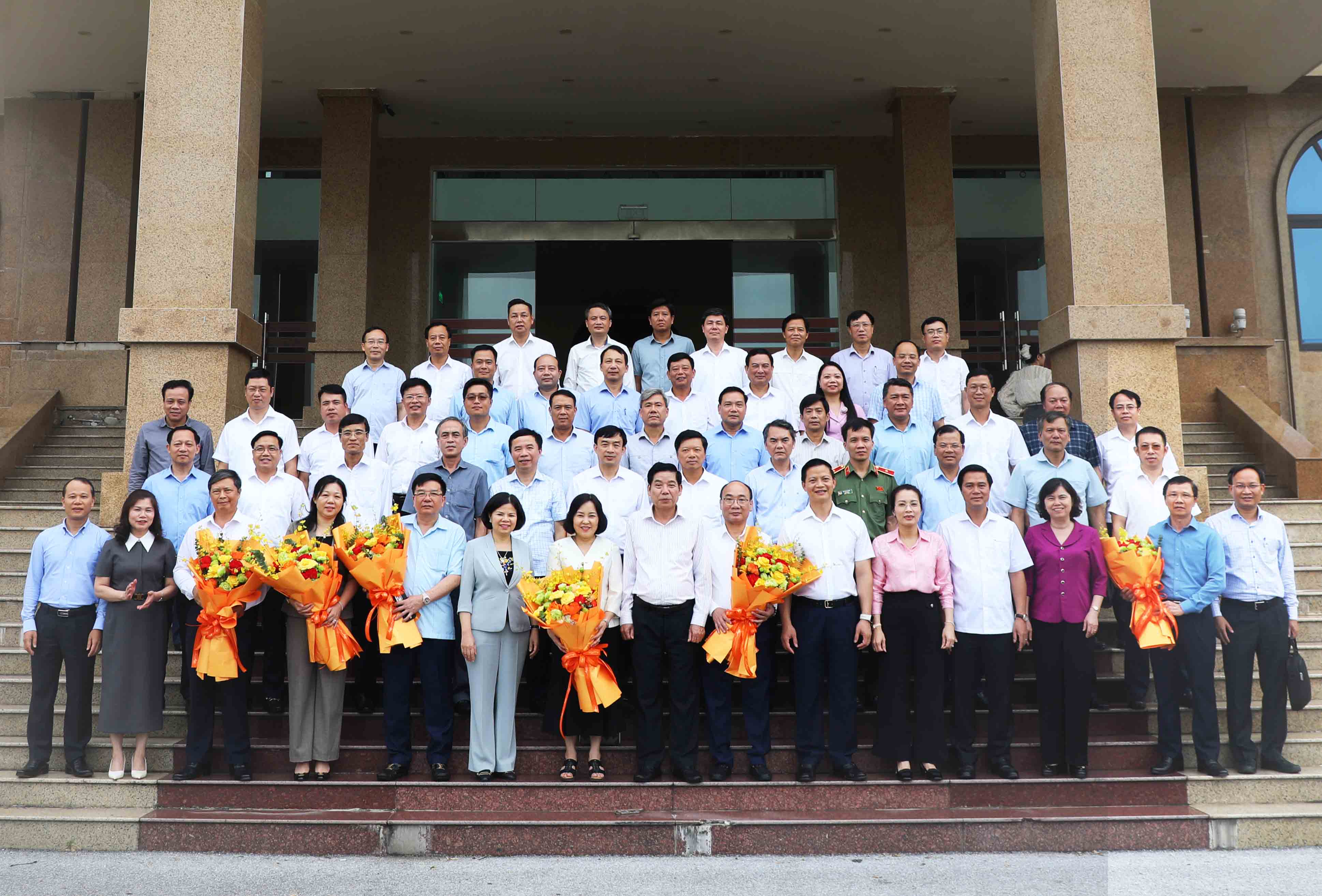 Phó Bí thư Thường trực Tỉnh ủy Nguyễn Thị Hương và Phó Bí thư Tỉnh ủy, Chủ tịch UBND tỉnh Vương Quốc Tuấn tặng hoa chức mừng các đồng chí Tỉnh ủy viên nghỉ hưu.