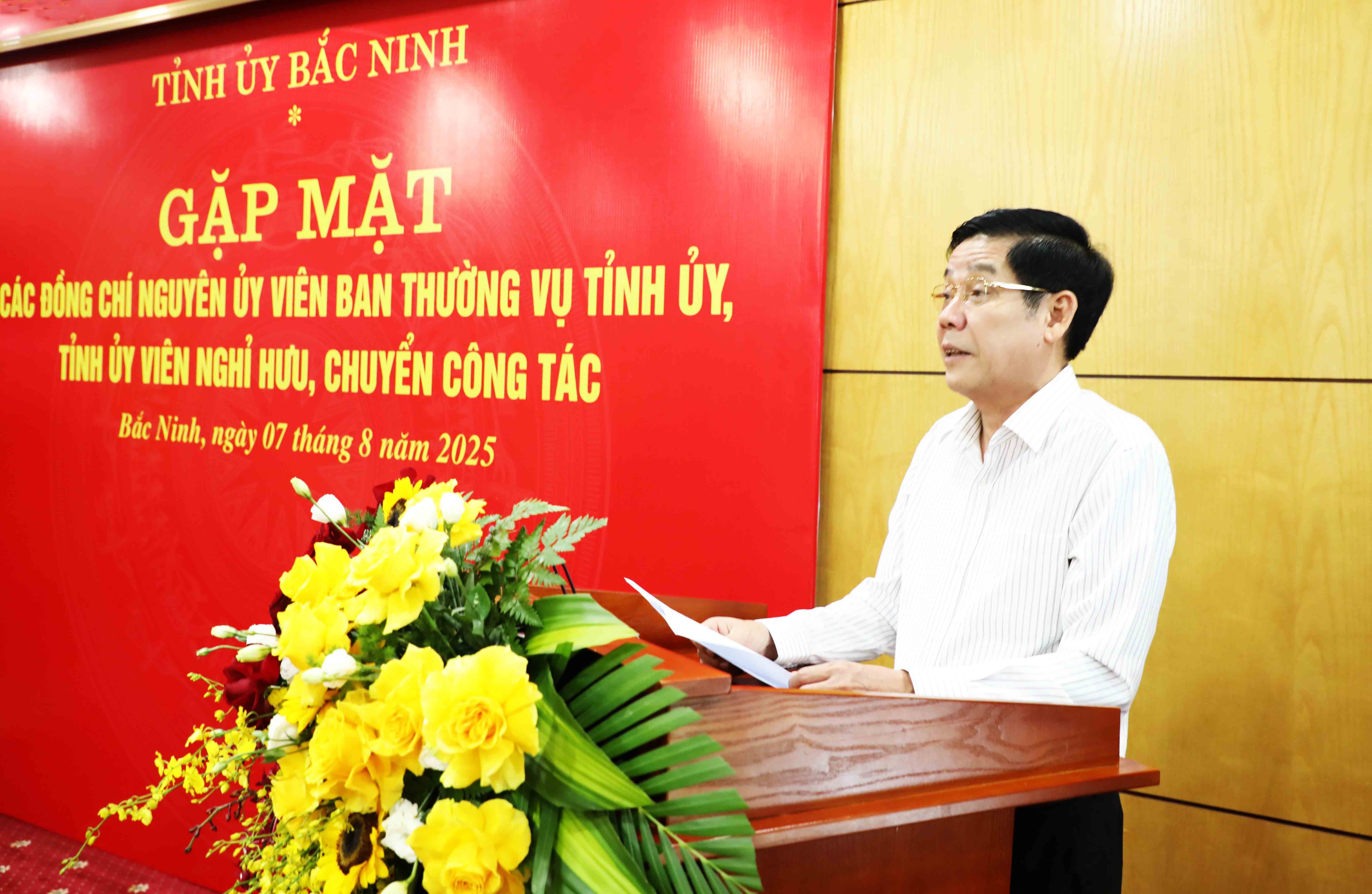 Phát biểu tại buổi gặp mặt, thay mặt Ban Chấp hành Đảng bộ tỉnh, Bí thư Tỉnh ủy Nguyễn Văn Gấu gửi lời chúc mừng, tri ân tới các đồng chí Ủy viên BTV Tỉnh ủy, Tỉnh ủy viên nghỉ hưu, chuyển công tác. Đồng thời, thông tin nhanh về tình hình phát triển kinh tế - xã hội của tỉnh đạt được trong 7 tháng đầu năm 2025, với nhiều chỉ tiêu tiếp tục xếp top đầu cả nước: Tăng trưởng kinh tế đạt 10,47%, đứng thứ 5 toàn quốc; thu hút đầu tư FDI đứng thứ 2 cả nước; thu ngân sách đạt trên 46.455 tỷ đồng, đạt 81,7% kế hoạch. Tỉnh hoàn thành chỉ tiêu xóa 100% nhà tạm, nhà dột nát cho hộ nghèo, hộ cận nghèo, người có công trong năm 2025. Các mặt công tác xây dựng Đảng, xây dựng hệ thống chính trị, bảo đảm quốc phòng, an ninh đạt nhiều kết quả tích cực; dư luận chung trong cán bộ, đảng viên, Nhân dân tin tưởng, đồng thuận và phấn khởi trước sự phát triển của tỉnh.