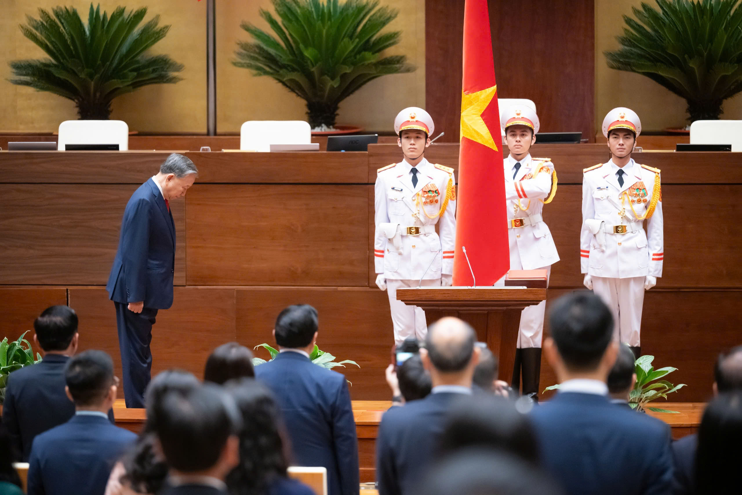 Trước Quốc hội và đồng bào, cử tri cả nước, Chủ tịch nước Tô Lâm tuyên thệ: "Dưới cờ đỏ sao vàng thiêng liêng của Tổ quốc, trước Quốc hội và đồng bào, cử tri cả nước, Tôi - Chủ tịch nước Cộng hòa xã hội chủ nghĩa Việt Nam xin tuyên thệ: Tuyệt đối trung thành với Tổ quốc, với Nhân dân, với Hiến pháp nước Cộng hòa xã hội chủ nghĩa Việt Nam, nỗ lực phấn đấu, hoàn thành tốt mọi nhiệm vụ được Đảng, Nhà nước và Nhân dân giao phó".