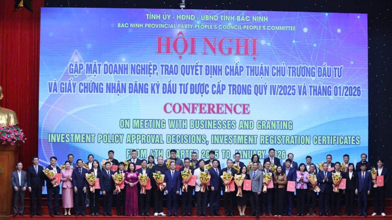 Chiều 2/2, tỉnh Bắc Ninh tổ chức Hội nghị gặp mặt doanh nghiệp, trao Quyết định chấp thuận chủ trương đầu tư và Giấy chứng nhận đăng ký đầu tư trong Quý IV/2025 và tháng 1/2026. Đồng chí Nguyễn Hồng Thái, Ủy viên Trung ương Đảng, Bí thư Tỉnh ủy Bắc Ninh dự hội nghị.