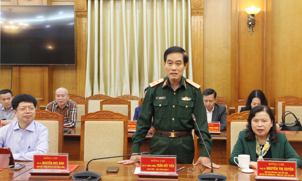 GS.TS. Trung tướng Trần Viết Tiến - Giám đốc Học viện Quân y, đại diện các đại biểu phát biểu ý kiến tại chương trình gặp mặt.