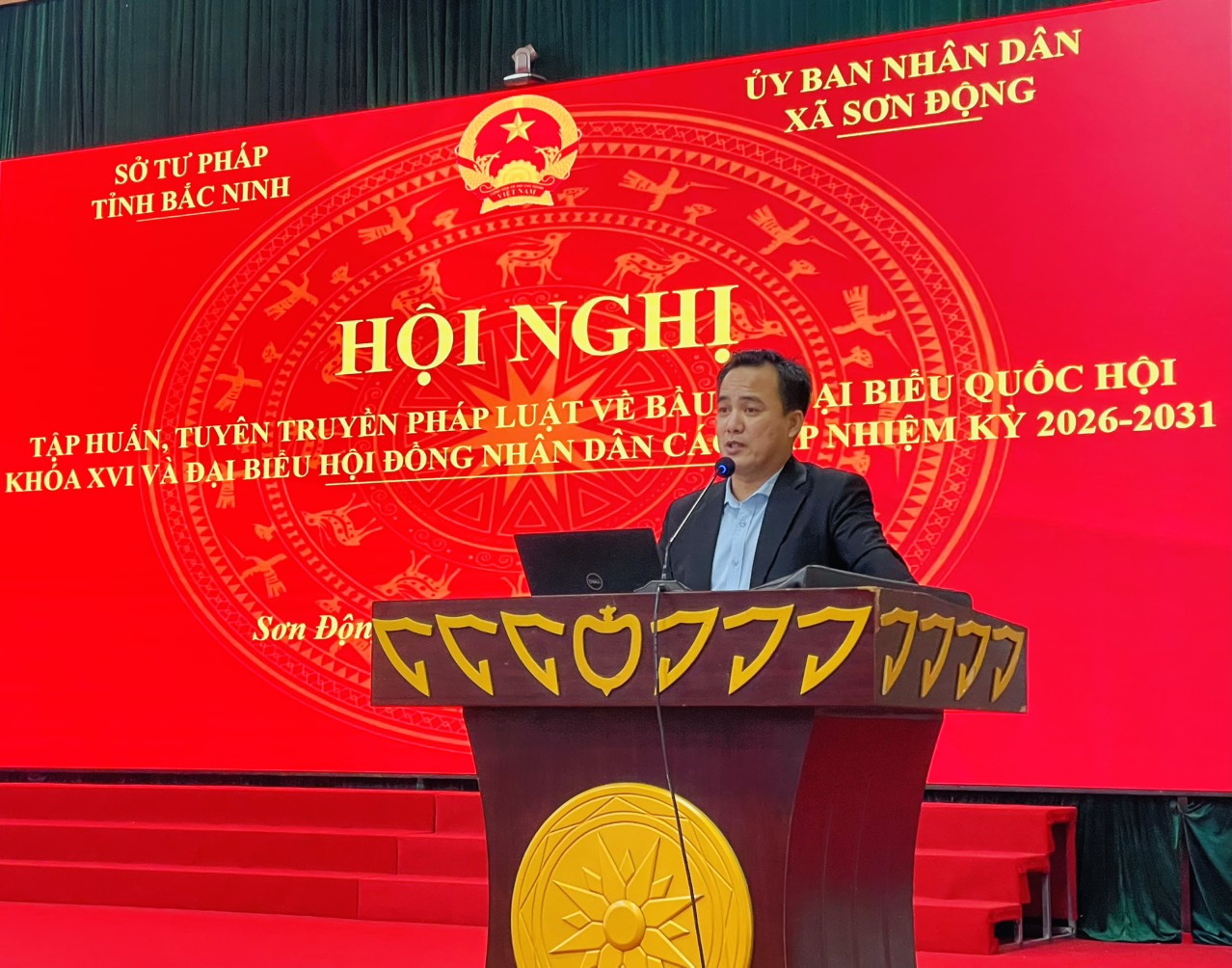 Sáng ngày 29 và 30/01/2026, Sở Tư pháp tỉnh Bắc Ninh phối hợp với UBND xã Sơn Động và UBND xã Kiên Lao tổ chức Hội nghị tập huấn, tuyên truyền phổ biến giáo dục pháp luật về bầu cử đại biểu Quốc hội khóa XVI và đại biểu HĐND các cấp nhiệm kỳ 2026-2031. Dự hội nghị có gần 400 đại biểu tham dự là đại diện lãnh đạo Đảng uỷ xã, UBND xã; Thành viên Ủy ban bầu cử xã; Thành viên các Tiểu ban của Ủy ban bầu cử xã và  các Tuyên truyền viên pháp luật xã; Bí thư chi bộ, Trưởng thôn, Trưởng ban công tác mặt trận ở khu dân cư và những người tham gia vào công tác tuyên truyền pháp luật về bầu cử.