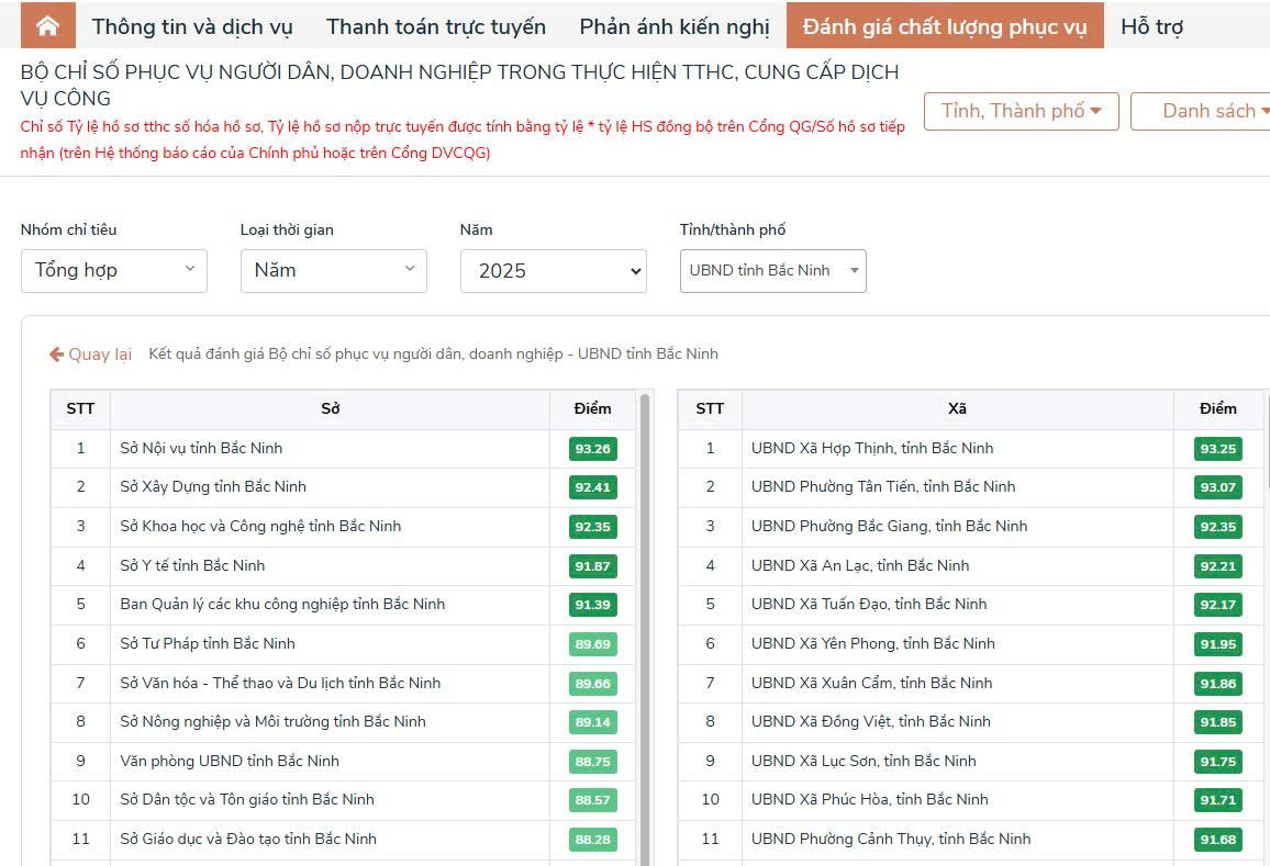 Đến thời điểm tháng 9 năm 2025, Sở Nội vụ đạt tổng điểm: 93.72 điểm. Trong đó, công khai minh bạch: 18/18; Tiến độ giải quyết: 19.31/20; Dịch vụ công trực tuyến: 10/12; Thanh toán trực tuyến: 10/10; Mức độ hài lòng: 18/18; Số hóa hồ sơ: 18,41/22. Như vậy có thể thấy trong 6 chỉ tiêu đánh giá ngoài 2 chỉ tiêu công khai minh bạch và mức độ hài lòng đều đạt điểm tuyệt đối 18/18 điểm thì Sở Nội vụ là đơn vị dẫn đầu toàn tỉnh ở chỉ số số hóa hồ sơ; đồng thời đạt tổng điểm cao nhất toàn tỉnh.