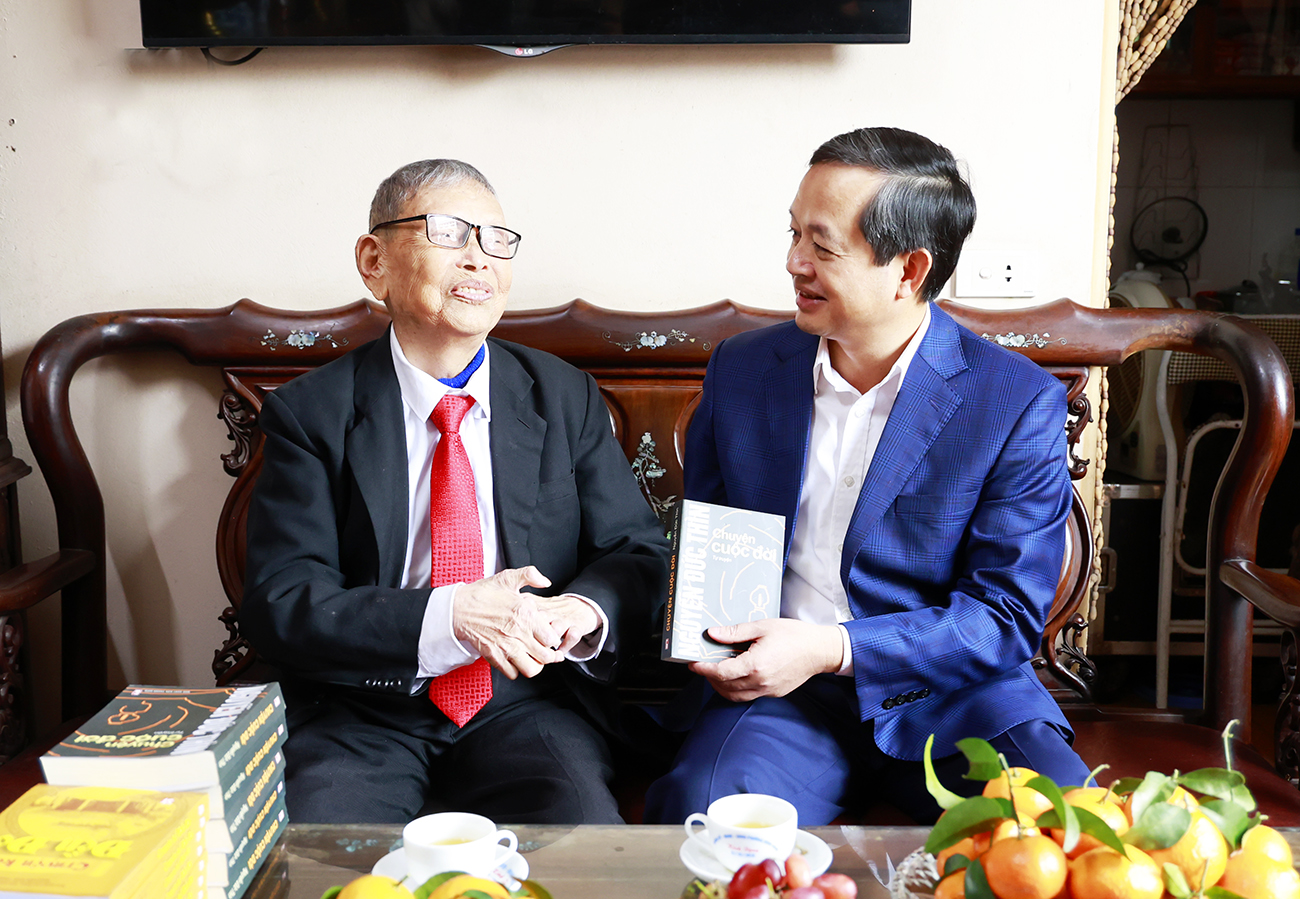 노동 영웅·인민 교사 응우옌 득 틴(Nguyen Duc Thin)이 팜 황 썬(Pham Hoang Son) 박닌성 인민위원회 위원장에게 『인생 이야기(Chuyện cuộc đời)』 책을 선물하고 있다